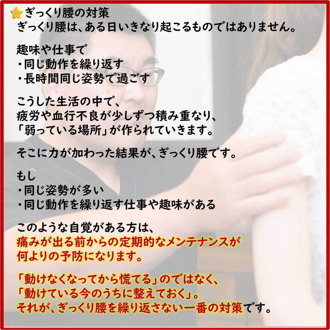 それが、ぎっくり腰を繰り返さない一番の対策です。